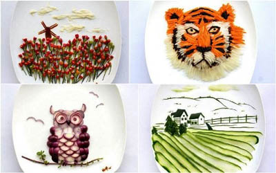 Với những loại thực phẩm thường thấy trong bữa ăn hàng ngày như hành, dưa chuột, trứng, cà rốt…, Hong Yi đã cho ra những tác phẩm tranh đẹp mắt và có tính nghệ thuật cao.