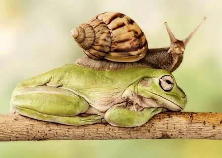 Con sên bò trên lưng ếch tới 8 phút trong một khu vườn ở thành phố Jakarta, Indonesia.