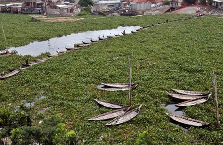 Lục bình giăng kín dòng sông Buriganga khiến tàu bè di chuyển qua lại một cách khó khăn. Để di chuyển trên sông Buriganga khi dòng sông bị tắt nghẽn do sự phát triển của lục bình vượt quá mức, một nhóm các thuyền viên tại địa phương Dhaka của Bangladesh đã đưa ra một ý tưởng sáng tạo, người ta tự làm cây cầu nổi này gồm có 34 chiếc thuyền gỗ kết nối lại với nhau.