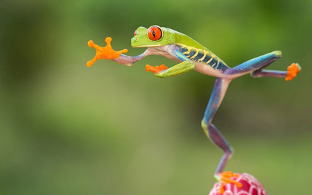 Ếch xanh mắt đỏ là loài có khả năng nhảy cao đáng kinh ngạc trong họ hàng nhà ếch. Một con ếch thậm chí có thể bật lên 1,5 mét.