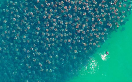 Chắc hẳn mọi người sẽ thấy rất khó hiểu khi lần đầu nhìn bức ảnh này. Nhưng nếu giải thích đây là tập hợp của hàng nghìn con cá đuối điện (Munk's devil ray) thì bạn sẽ phải thốt lên ngạc nhiên đấy! Nhiếp ảnh gia người Đức Florian Schulz vô tình chụp được cảnh này khi đang săn tìm cá voi di trú ở biển Mexico.