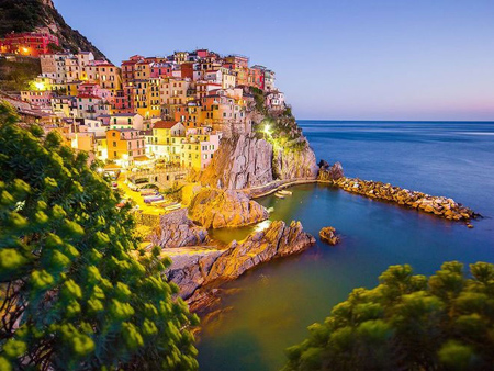 Những ngôi nhà vàng rực ánh đèn bắt mắt ở Manarola, Italy.