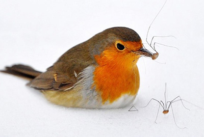 Chim cổ đỏ tóm được một con nhện trên tuyết ở Essen, Đức