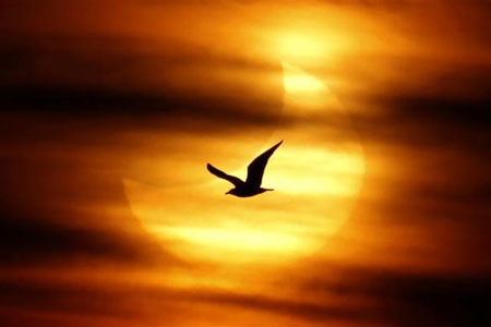 Hình ảnh tuyệt đẹp hiếm có khi một con mòng biển bay qua mặt trời lúc bình minh, khi diễn ra nhật thực ở bãi biển Guadalmar ở Malaga, Tây Ban Nha, ngày 4/1.