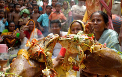 Đôi ếch sẽ được dân làng rải bột màu da cam lên đầu và hoa sặc sỡ với một ngọn nến ở phía trước để chụp ảnh cưới. Một số địa phương ở Ấn Độ, ếch được coi là loài có sức mạnh đặc biệt vì nó có thể cảm nhận được trời mưa sắp đến.