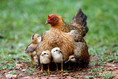 Tại ngoại ô Bangkok (Thái Lan), gà mẹ dang đôi cánh che mưa cho đàn con.