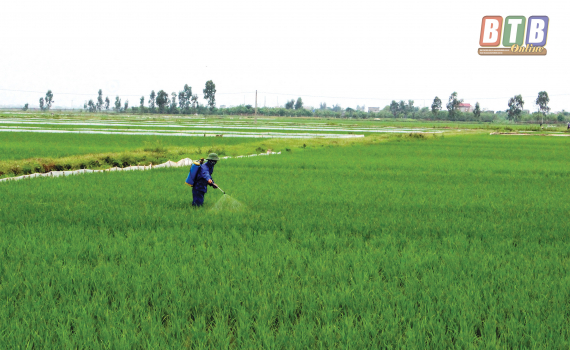 Nông dân huyện Tiền Hải phòng, trừ sâu bệnh bảo vệ lúa xuân.
