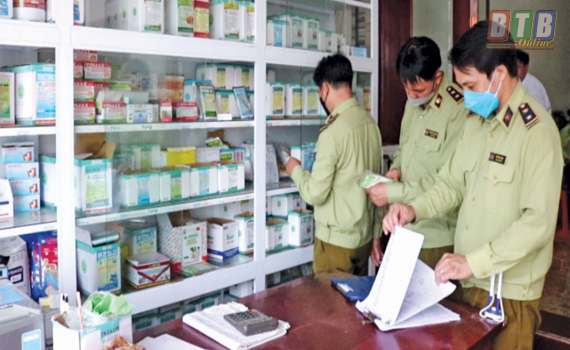 Đội Quản lý thị trường số 5 kiểm tra việc kinh doanh thuốc thú y tại xã Đông Lâm (Tiền Hải).