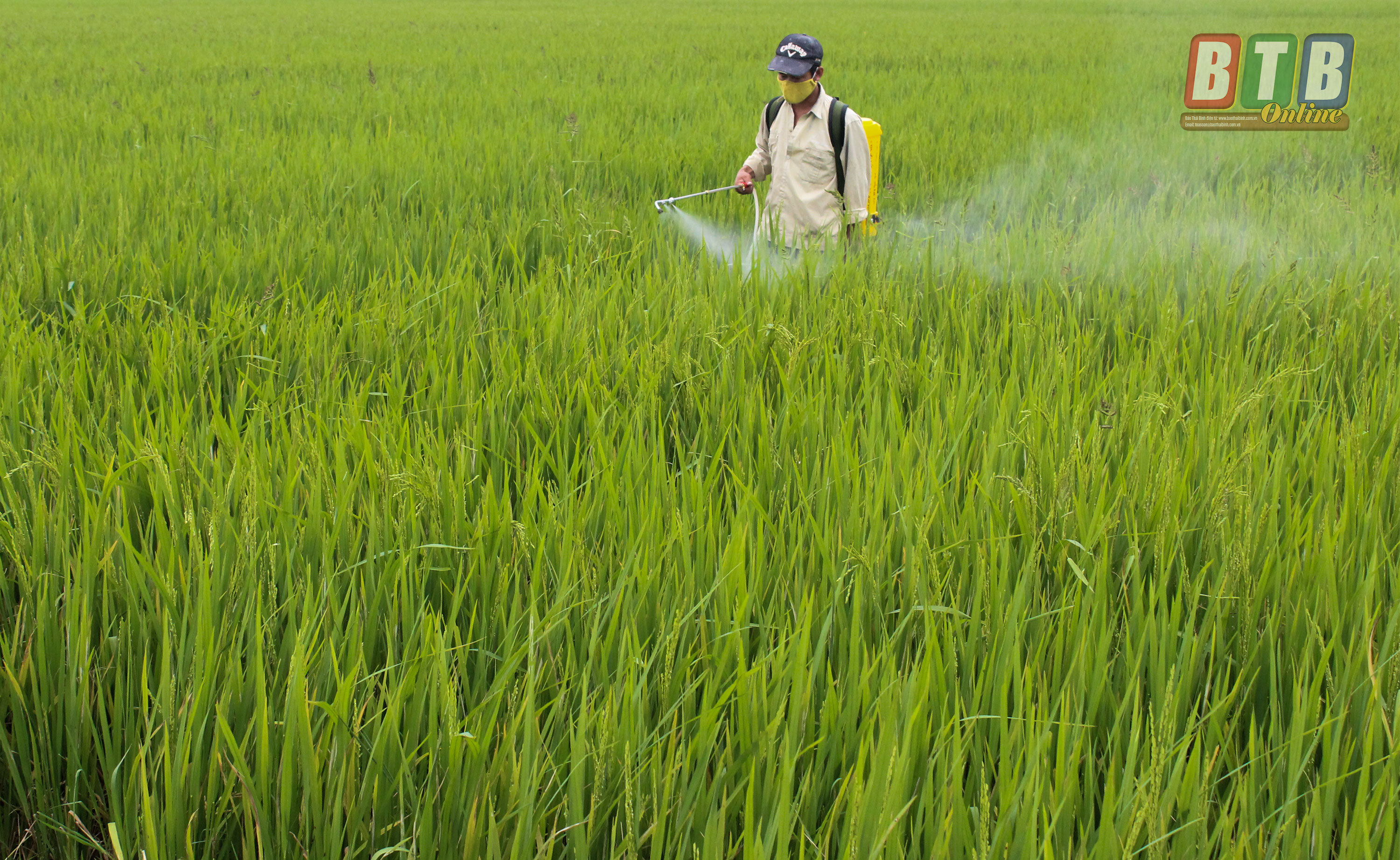 Nông dân thị trấn Tiền Hải phòng, trừ sâu bệnh bảo vệ lúa xuân cuối vụ. Ảnh: Mạnh Thắng