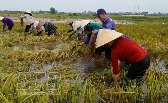 Hội Phụ nữ xã Vũ Thắng tổ chức gặt lúa bị ngập, đổ cho hộ nghèo có hoàn cảnh khó khăn sau bão số 7.