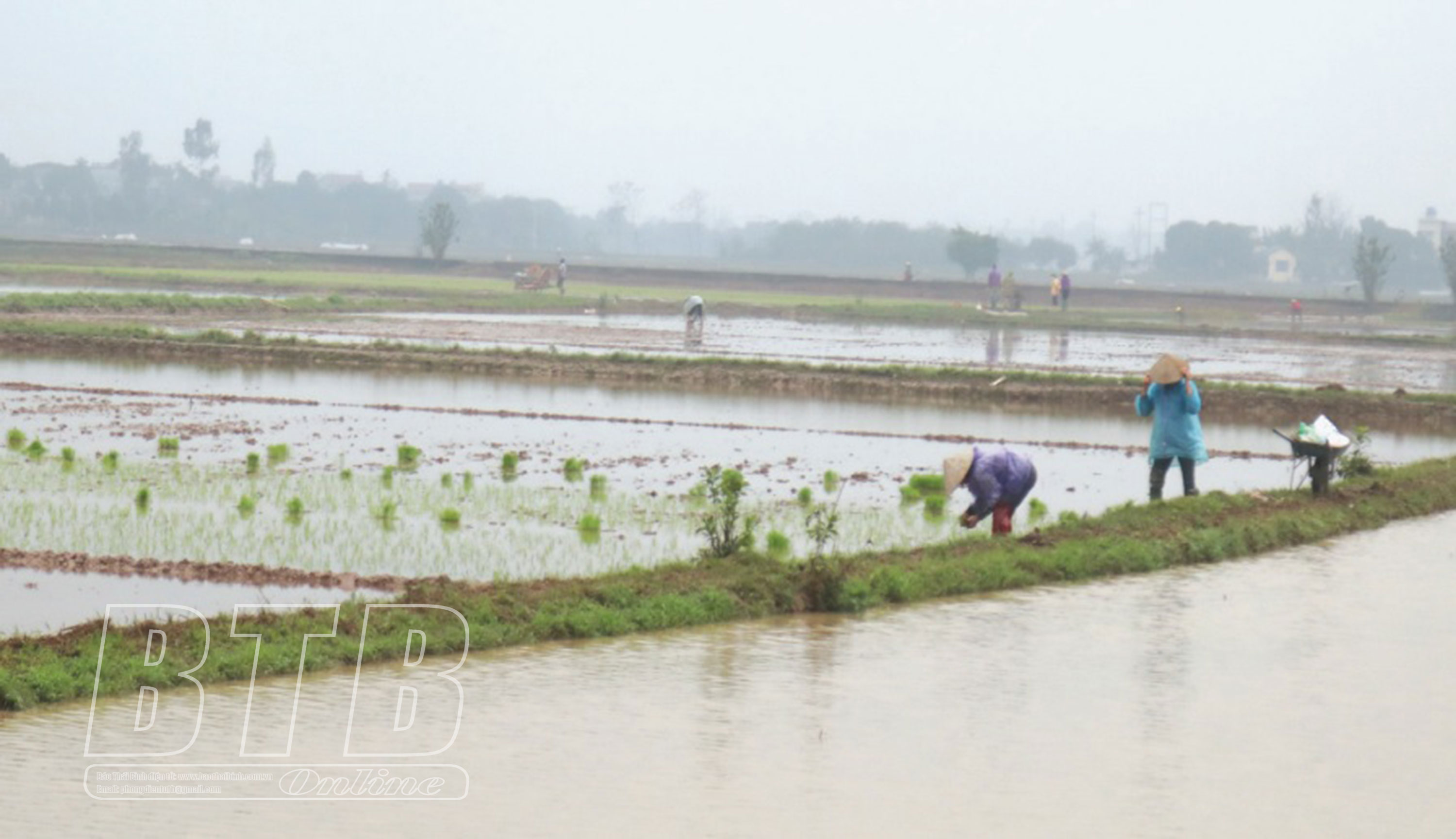 Tranh thủ thời tiết thuận lợi, nông dân các địa phương ở Quỳnh Phụ ra đồng gieo cấy cho kịp thời vụ.