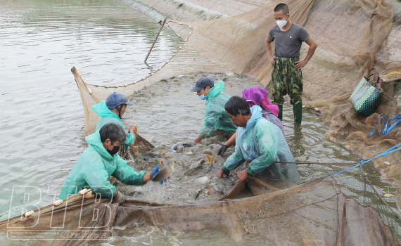 Mô hình tích tụ ruộng đất, quy hoạch ao bán nổi để nuôi cá của gia đình anh Phạm Mạnh Hùng, thôn 1, xã Vũ Đoài cho hiệu quả kinh tế cao.