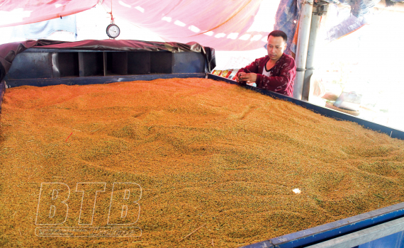 Anh Lê Văn Tuấn, thôn Mễ Sơn 1, xã Tân Phong (Vũ Thư) kiểm tra thóc tại giàn sấy của gia đình.