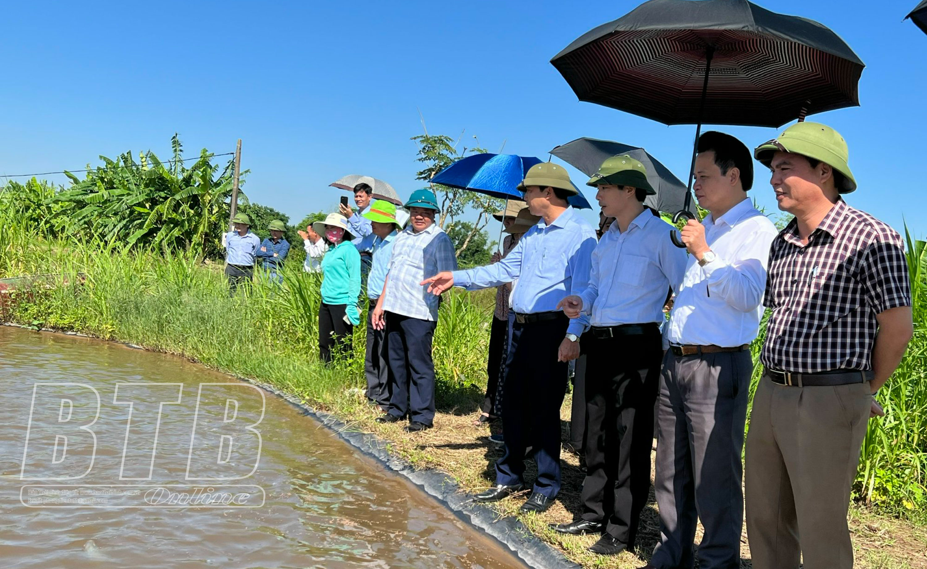 Đoàn thăm mô hình nuôi cá trong ao bán nổi tại xã Bình Định (Kiến Xương).