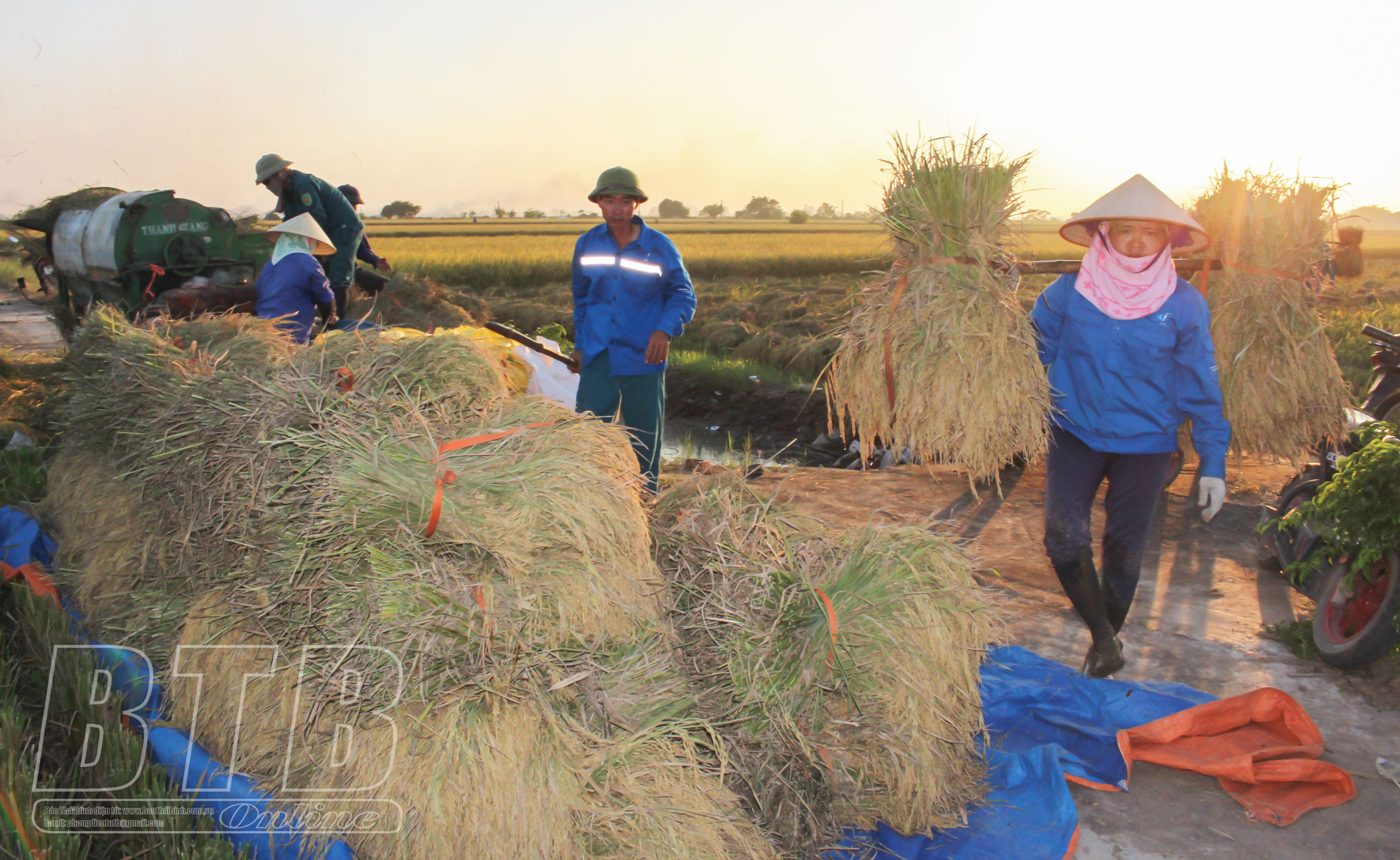 Trên cánh đồng thôn An Ninh (Thụy Bình) những ngày này, bà con nông dân cùng máy gặt đang hối hả chạy đua với thời gian để thu hoạch lúa mùa, nhanh chóng giải phóng đất làm vụ đông.
