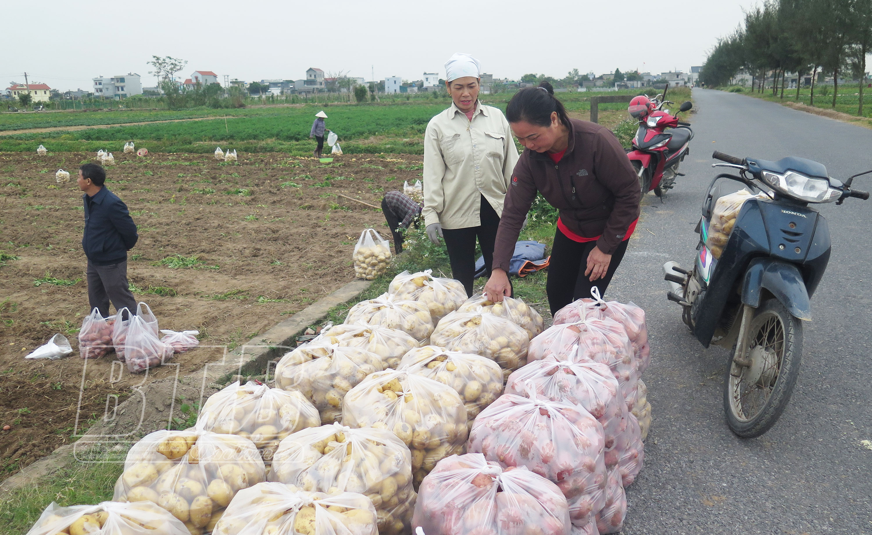 Ông Phùng Đình Chiểu, Giám đốc HTX SXKD DVNN xã cho biết: Vụ đông năm 2022, toàn xã trồng 80ha khoai tây, trong đó thôn Tri Lễ trồng nhiều nhất, khoảng 30ha. Khoai tây là cây vụ đông ưa lạnh nhưng do thời tiết năm nay ấm hơn nên năng suất đạt thấp, dự tính bình quân đạt 5 tạ/sào song giá bán lại cao hơn mọi năm với mức 8.000 đồng/kg. Tính bình quân năng suất đạt 13,5 tấn/ha cho giá trị trên 100 triệu đồng, trừ chi phí mỗi sào thu lãi khoảng 1,5 - 2 triệu đồng. Sau 70 - 80 ngày trồng, nông dân bắt đầu thu hoạch. Vui nhất với bà con là sản phẩm thu hoạch đến đâu được thương lái về tận ruộng thu mua ngay tới đó, nhiều nhà muốn lãi cao hơn sẽ chở đi các chợ bán.