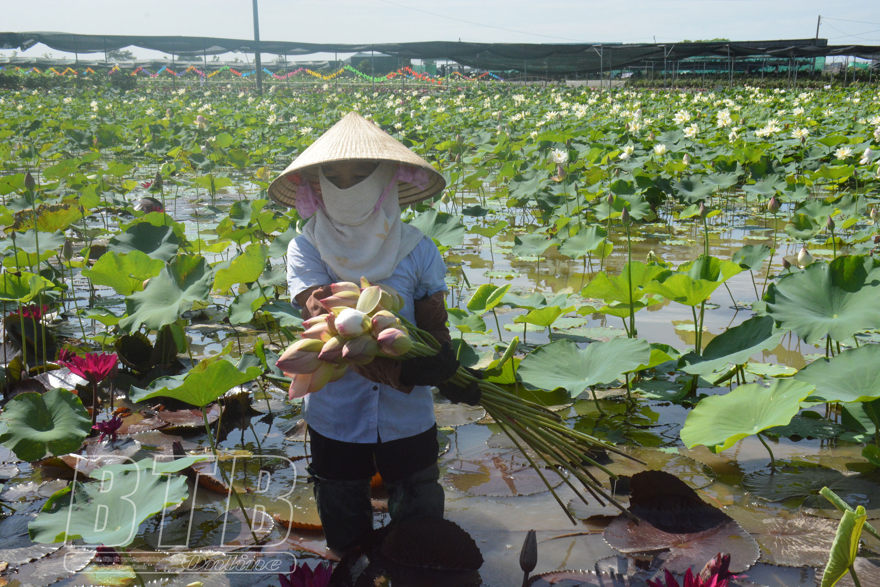 Thu hoạch hoa sen tại Hợp tác xã Hoa sen Vân Đài, xã Chí Hòa (Hưng Hà).