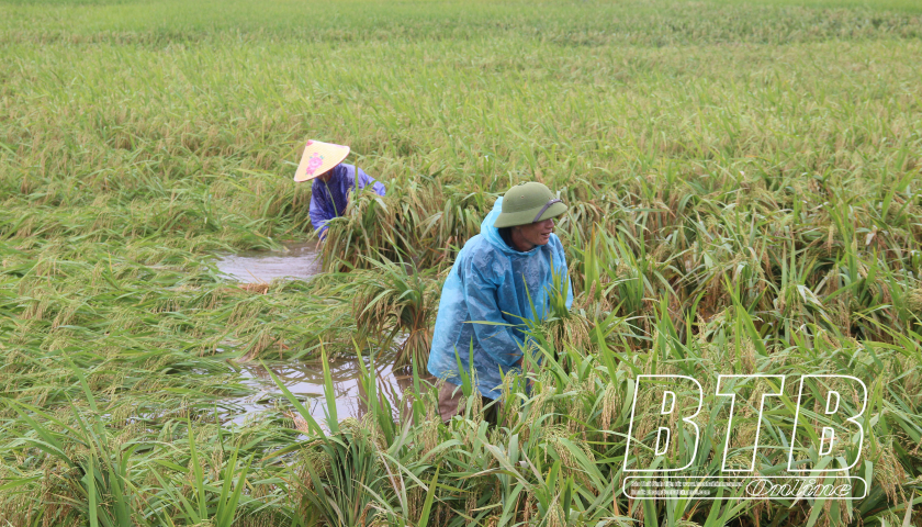 Chỉ một tuần nữa, 6 sào lúa TBR225 của gia đình chị Trịnh Thị Hiền, xã Trung An (Vũ Thư) cho thu hoạch. Tuy nhiên, đợt mưa lớn kéo dài đã làm 2 sào bị đổ, ngập dưới nước. Tranh thủ thời tiết tạnh ráo, chị Hiền ra đồng buộc dựng tránh bông lúa lên mộng. Chị chia sẻ: Vụ mùa này lúa tốt, bông dài, mẩy hạt, năng suất dự kiến trên 2 tạ/sào. Cũng vì bông lúa nặng nên gặp mưa, gió lớn dễ đổ gãy. Ngoài việc tháo rút nước mặt ruộng, tôi tập trung buộc dựng tránh cho bông thóc ngập lâu trong nước, lên mộng ảnh hưởng tới năng suất, chất lượng gạo.