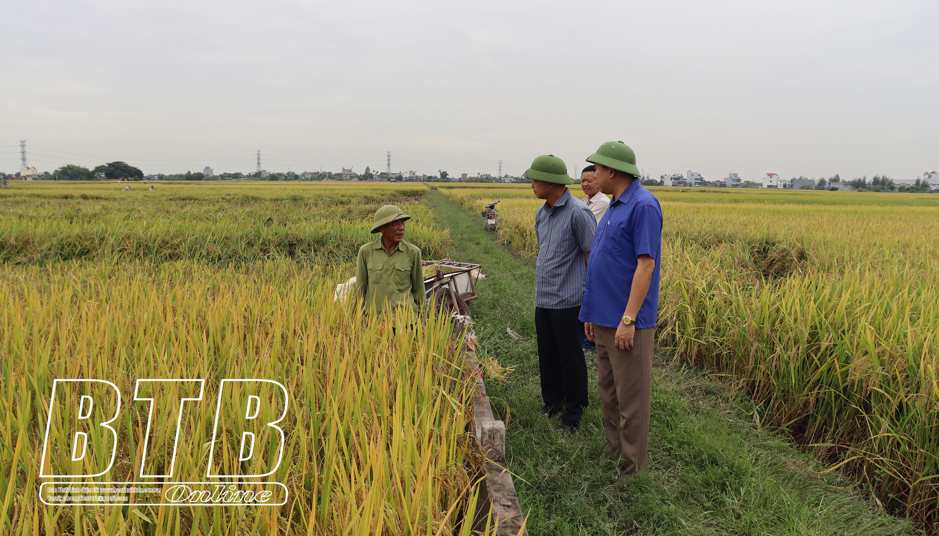 Lãnh đạo huyện Kiến Xương kiểm tra tiến độ thu hoạch lúa mùa năm 2023.