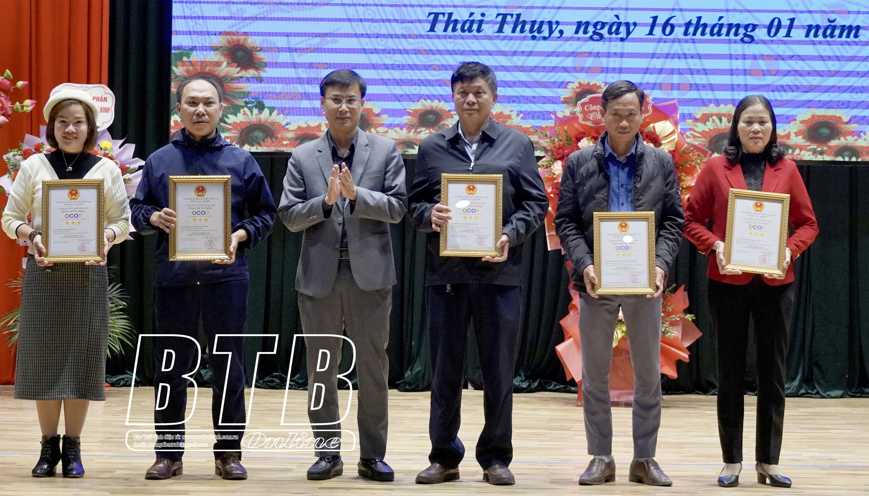 Lãnh đạo huyện Thái Thụy trao giấy chứng nhận OCOP năm 2023 cho các đơn vị chủ thể.