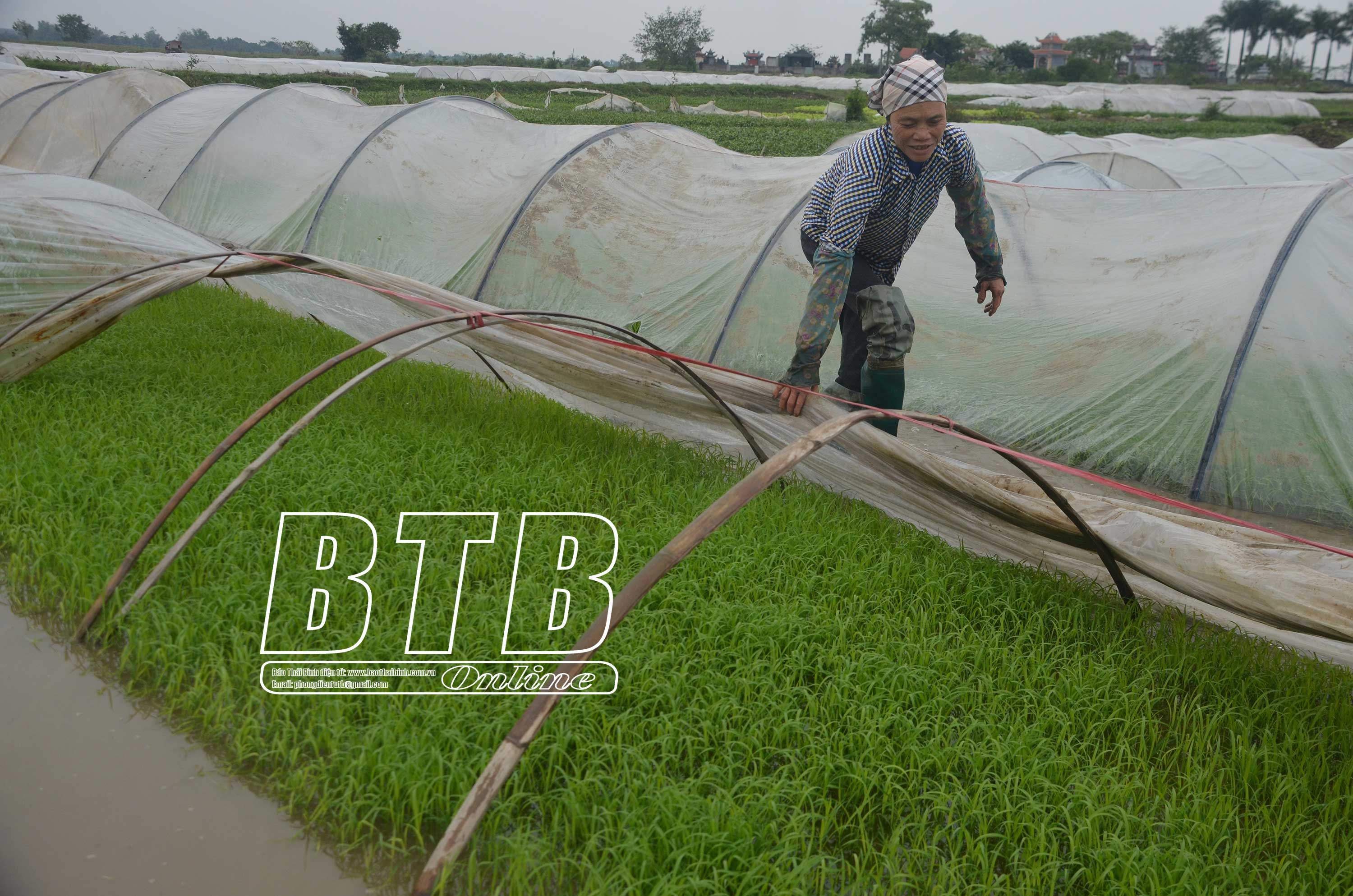 Nông dân huyện Quỳnh Phụ phủ nilon tránh rét cho mạ.
