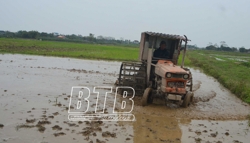 HTX DVNN xã Quỳnh Hoa (Quỳnh Phụ) huy động máy làm đất bảo đảm gieo cấy theo lịch thời vụ.