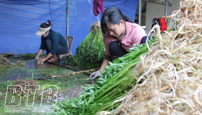 Gia đình anh Trần Bá Tám, chị Trần Thị Quỳnh, thôn Bổng Điền Nam trồng gần 1 mẫu rau cần. Chị Quỳnh chia sẻ: Những ngày giáp tết, bà con khắp nơi tất bật mua sắm, vui chơi, thì người trồng rau cần chúng tôi có mặt ở ao, ở ruộng từ 4 - 5 giờ sáng đến 9 - 10 giờ đêm để thu hoạch, nhặt rửa, bó rau cần. Thời gian cao điểm dịp tết, nhu cầu tiêu thụ rau cần rất cao nên gia đình tôi thường huy động 7 - 8 lao động, mỗi ngày thu hoạch 3 - 4 tạ, có ngày 5 - 6 tạ rau cần.