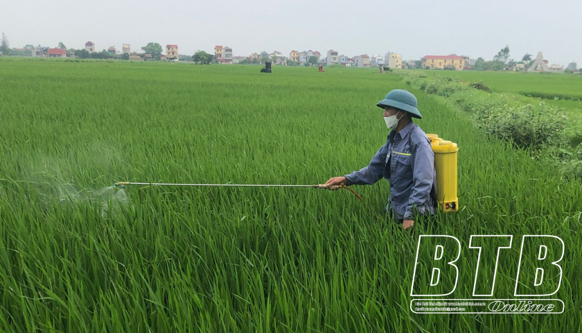 Nông dân xã Điệp Nông Hưng Hà chủ động phòng trừ sâu bệnh bảo vệ lúa xuân.