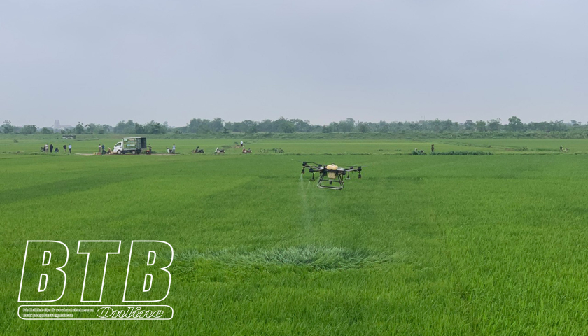 Nông dân xã Nam Hải sử dụng máy bay không người lái phun thuốc trừ sâu.