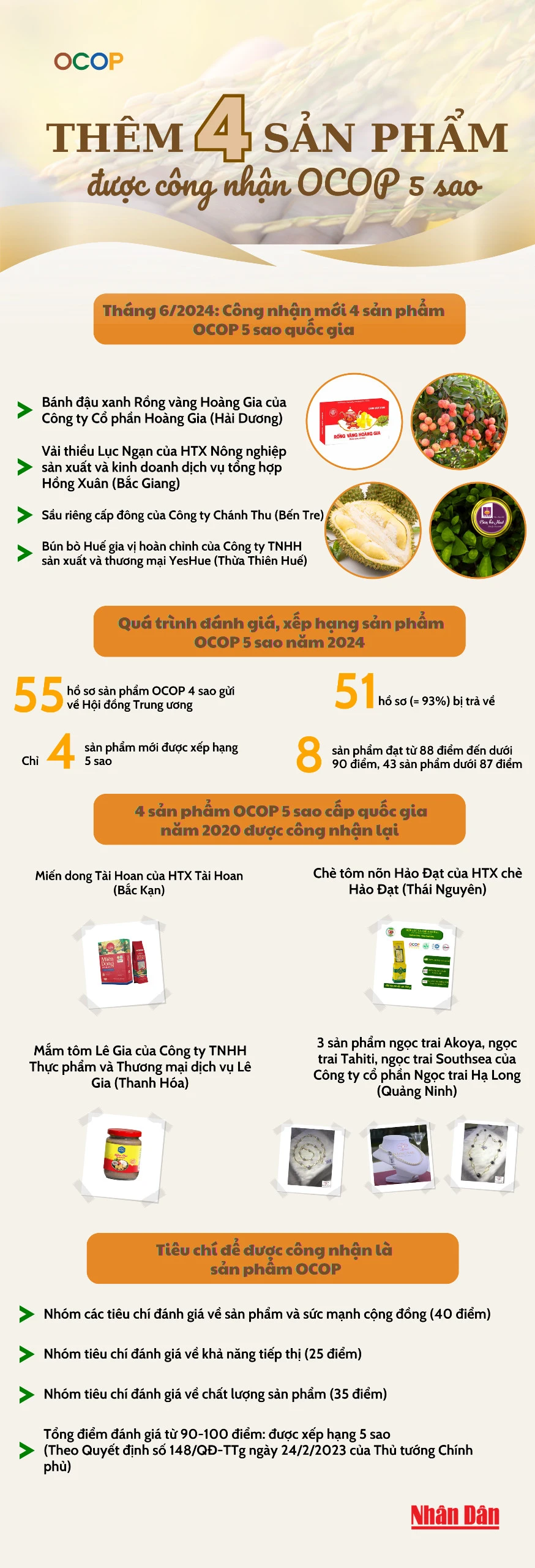 Hội đồng đánh giá, phân hạng sản phẩm Chương trình mỗi xã một sản phẩm cấp Trung ương năm 2024 đã công nhận mới 4 sản phẩm OCOP 5 sao vào tháng 6 vừa qua. Đó là các sản phẩm: Bánh đậu xanh Rồng vàng Hoàng Gia, vải thiều Lục Ngạn, sầu riêng cấp đông Chánh Thu và bún bò Huế gia vị hoàn chỉnh YesHue.