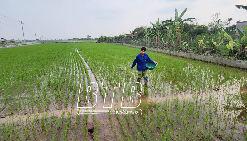 Nông dân huyện Kiến Xương chăm sóc lúa xuân.