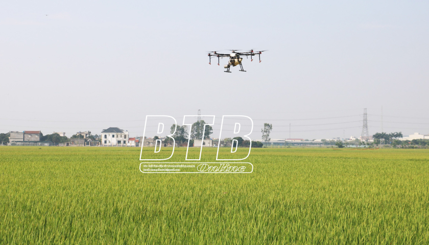 Nông dân xã Đông Tân (Đông Hưng) phun thuốc phòng, trừ sâu bệnh bằng thiết bị bay không người lái nhằm giảm chi phí, tăng hiệu quả.