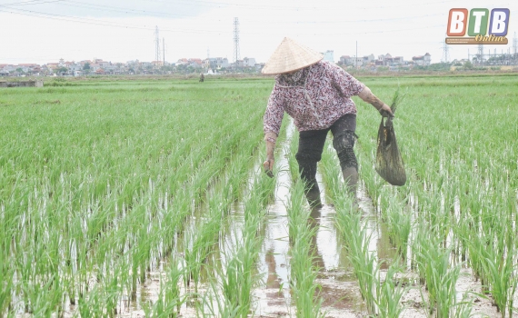 Nông dân huyện Đông Hưng tỉa dặm, bắt ốc bươu vàng trên lúa xuân.