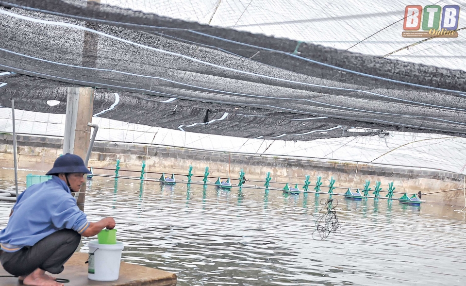 Anh Ngọc cho biết: Tôi đã xuống giống nuôi thả gần một triệu con tôm thẻ chân trắng trên diện tích hơn 1ha. Do nuôi công nghiệp thả với mật độ dày nên trước khi xuống giống tôi đã thực hiện tốt công tác cải tạo ao nuôi, trong đó nạo vét sạch đáy ao và diệt tạp bằng các loại hóa chất và vôi bột.