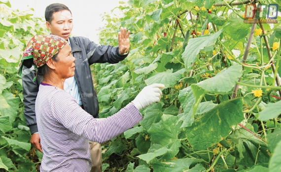 Cán bộ hợp tác xã hướng dẫn nông dân kỹ thuật thu hoạch dưa chuột.