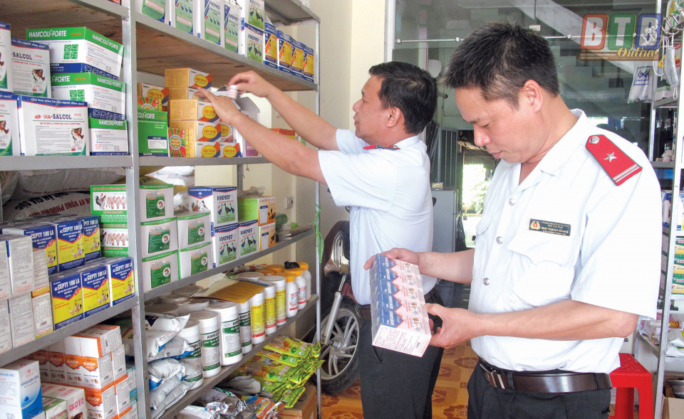Cán bộ ngành Nông nghiệp thanh tra vật tư, thuốc thú y tại một cơ sở kinh doanh xã Đông Kinh (Đông Hưng).