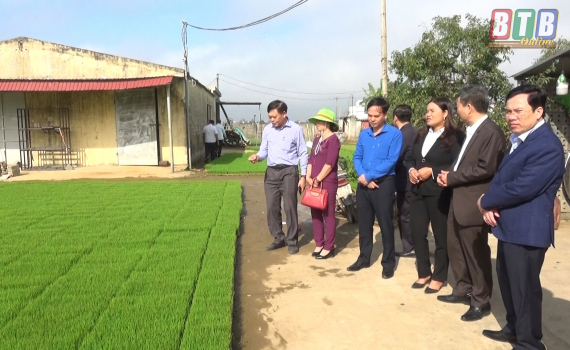 Lãnh đạo huyện Kiến Xương kiểm tra mô hình gieo mạ khay cấy bằng máy tại xã Bình Minh.