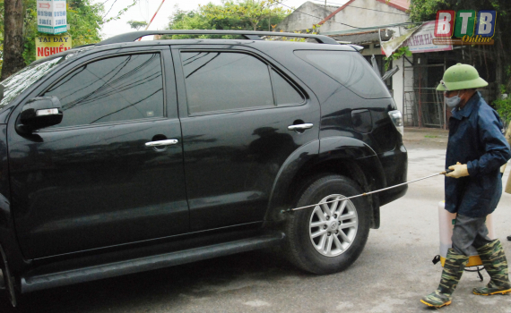 Lực lượng chức năng tại chốt kiểm dịch động vật xã Văn Cẩm, huyện Hưng Hà phun hóa chất khử trùng tiêu độc phương tiện ra vào địa phương phòng, chống bệnh dịch tả lợn châu Phi.