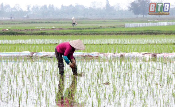 Thực hiện phương châm tưới nước theo công thức nông - lộ - phơi, tưới nông và giữ ẩm xen kẽ giúp lúa đẻ nhánh sớm, khỏe, tập trung. Tiến hành tỉa dặm, bảo đảm mật độ; bảo quản tốt diện tích mạ còn dư thừa tại nơi gieo để dự phòng khi có diễn biến bất thường. Tranh thủ thời tiết ấm, bón thúc kịp thời ngay sau khi lúa bắt đầu đẻ nhánh bằng phân NPK chuyên thúc với quan điểm bón nặng đầu nhẹ cuối, tăng cường bón thêm lân supe hoặc các dạng phân NPK giàu lân cho lúa mới cấy và lúa gieo thẳng. Đối với diện tích lúa cấy sớm có nguy cơ trỗ bông đầu tháng 4 cần chủ động biện pháp bón phân thúc làm 2 đợt để kéo dài thời gian sinh trưởng; diện tích lúa chậm sinh trưởng, rễ đen khuyến cáo nông dân sử dụng các dạng phân qua lá có hàm lượng lân cao tạo điều kiện cho cây lúa sinh trưởng kịp thời. Phát động nông dân tập trung diệt chuột, ốc bươu vàng; tập trung nhân lực thu vớt bèo bồng để khơi thông dòng chảy, giảm chi phí nhân công, không dùng thuốc cỏ để diệt bèo và phun trên bờ thửa gây ô nhiễm môi trường, ảnh hưởng sức khỏe.