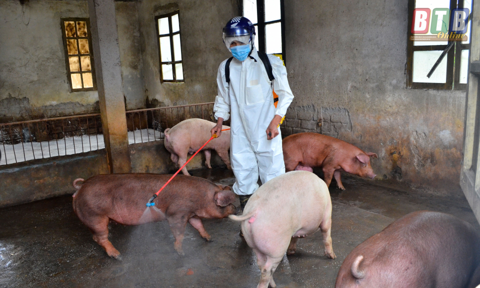 Các hộ chăn nuôi chủ động phun hoá chất phòng bệnh cho đàn lợn.