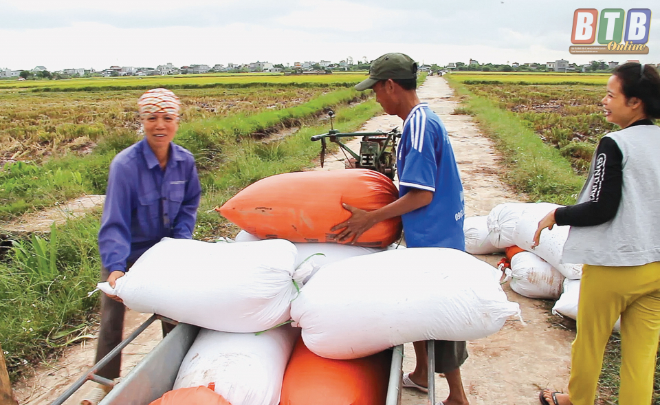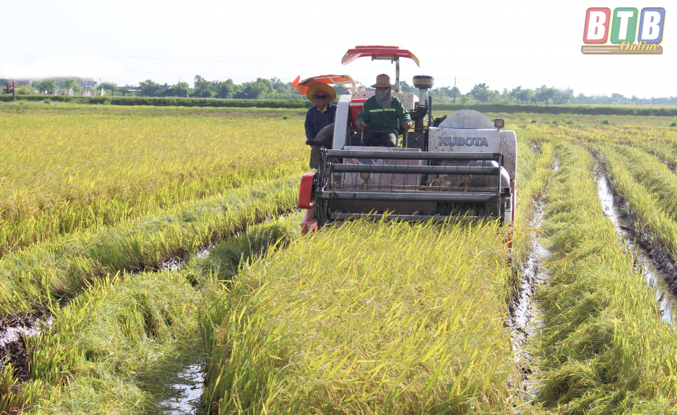 Nông dân huyện Tiền Hải đẩy nhanh tiến độ thu hoạch lúa xuân.