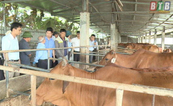 Lãnh đạo Hội Làm vườn tỉnh tham quan mô hình nuôi bò của anh Phạm Xuân Khánh, thôn Hưng Quan, xã Trọng Quan, huyện Đông Hưng.