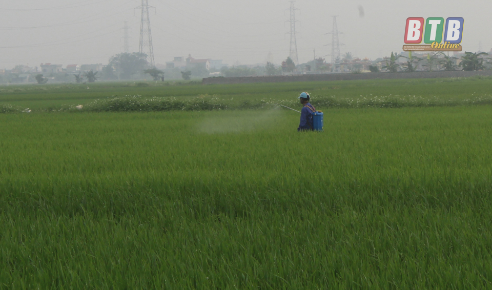 Nông dân xã Nguyên Xá phun thuốc bảo vệ lúa.