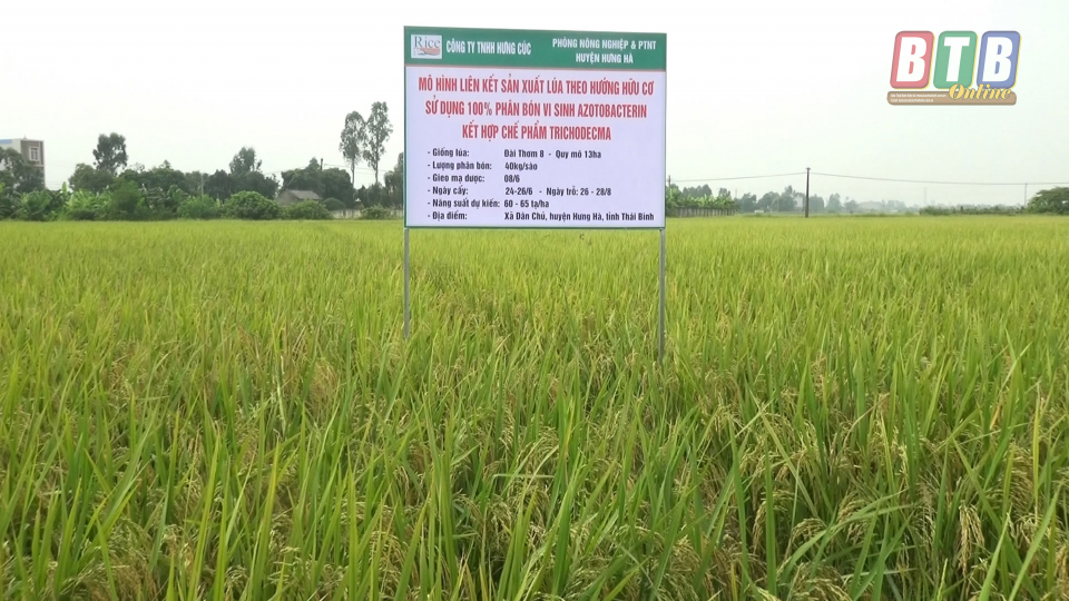 Được biết đây là vụ sản xuất lúa vụ mùa đầu tiên xã Dân Chủ triển khai gieo cấy thí điểm mô hình sản xuất lúa sạch chất lượng cao Đài thơm 8 với diện tích 14 ha, sử dụng 100% phân bón hữu cơ vi sinh liên kết với công ty TNHH Hưng Cúc . Ruộng mô hình áp dụng là ruộng ở mức độ trung bình, ruộng chuyên sản xuất 2 vụ lúa. quy trình sản xuất lúa theo hướng hữu cơ và 100% sử dụng phân chuồng được ủ bằng chế phẩm Trichoderma, không sử dụng phân bón hóa học, thuốc bảo vệ thực vật hóa học, chỉ sử dụng thuốc có nguồn gốc sinh học; chế độ tưới nước khoa học, phù hợp nhu cầu phát triển của cây lúa. Qua quá trình triển khai cho thấy, quy trình sản xuất theo hướng hữu cơ khả năng chống chịu sâu bệnh của cây lúa tốt hơn, trong thời kỳ lúa trổ bông ruộng ít nhiễm rầy, khô vằn, cho bông dài, lúa sạch sâu bệnh, cây sinh trưởng phát triển khỏe mạnh, cứng cây không bị đỗ ngã khi gặp mưa giông, năng suất cao.
