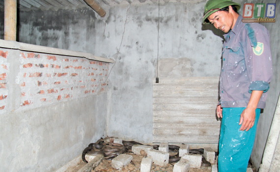 Đến nay, hộ ông Tô Văn Vân vẫn là gia đình duy nhất trên địa bàn xã Đông Cường nuôi rắn hổ mang, rắn hổ trâu. Đây là hướng chăn nuôi mới, cho lãi cao. Song để bảo đảm an toàn cho người nuôi và người dân sống xung quanh thì chuồng trại nuôi rắn phải được xây dựng cẩn thận, chắc chắn.