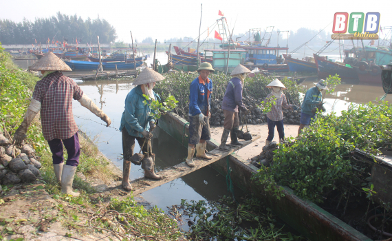 Người dân xã Thụy Hải (Thái Thụy) vận chuyển cây giống để trồng rừng ngập mặn ven biển.