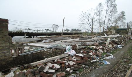 Đến trại gà đẻ trứng thương phẩm của bác Phạm Văn Tràng xã Vũ Đoài, người nông dân này đang tất bật thu dọn những chuồng trại bị tốc mái, kiểm tra số lượng gà còn lại và nhanh chóng gọi người sửa chữa điện đến dựng lại gần chục cột điện bị đổ dẫn từ làng xuống trang trại để kịp thời có ánh sáng cho những chuồng trại phục vụ chăn nuôi. Bận mải, vất vả như thế, nhưng bác Tràng cũng bớt chút thời gian cho biết: trận bão đi qua làm chết 2000 con gà thịt, 500 gà đẻ trứng, hơn 1500m2 mái Prôximăng bị tốc mái vỡ vụn, toàn bộ bạt bao quanh chuồng nuôi đều bị hỏng, phần lớn thức ăn chăn nuôi tại nhà chứa thức ăn đều bị nước mưa ngấm không thể sử dụng lâu dài… Tính sơ qua tổng thiệt hại trong cơn bão này khoảng 300 triệu đồng. Đối với người nông dân một nắng hai sương làm việc “lấy công làm lãi” như gia đình bác Tràng thì đó là một số tiền không hề nhỏ. Ngoài ra, trang trại của bác Tràng có 6 công nhân đang làm việc với mức lương hàng tháng là 2,5 – 3 triệu đồng/người, giờ mặc dù thiệt hại nhiều nhưng cũng không thể cho họ nghỉ vì sẽ ảnh hưởng đến cuộc sống của gia đình họ. Với trang trại có quy mô rộng gần 2000m2, bác Tràng nhanh chóng tập trung khắc phục hậu quả của bão, tiêu hủy số lượng gà chết, giữ ấm và chăm sóc số lượng gà còn sống, tu sửa lại phần chuồng trại đổ nát, nhập thêm con giống đưa vào nuôi, đồng thời thống kê thiệt hại mong nhận được sự giúp đỡ phần nào của các cấp, các ngành ổn định chăn nuôi.