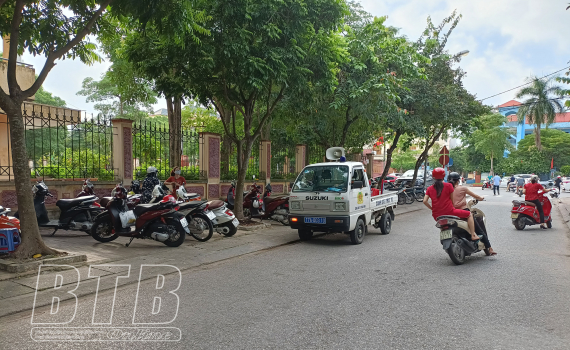 Lực lượng chức năng tham gia giữ gìn an ninh trật tự tại phố Đào Nguyên Phổ, trước cổng Trường Tiểu học Lê Hồng Phong, Trường THCS Lê Hồng Phong (thành phố Thái Bình).