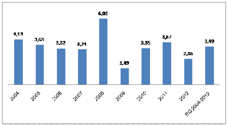 Trước hết, cần nhìn nhận tốc độ tăng giá (CPI) trong 2 tháng đầu năm (là những tháng trước và sau Tết Nguyên đán) trong thời gian từ 2004 đến 2012.