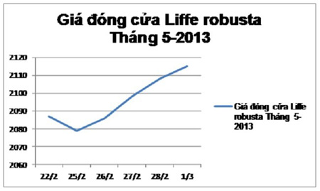 Trên sàn kỳ hạn robusta Liffe NYSE tuần này, sau khi giảm 8 đô la/tấn so với ngày thứ sáu 22-2 vào ngày đầu tuần, giá kỳ hạn robusta tăng vững. Đóng cửa phiên giao dịch cuối tuần khuya hôm qua thứ sáu 1-3 tức rạng sáng nay thứ bảy 2-3-2013, giá kỳ hạn robusta cơ sở tháng 5-2013 đứng mức 2.115 đô la, tăng 7 đô la so với ngày thứ năm 28-2 và tăng 28 đô la/tấn so với tuần trước (xin xem biểu đồ).